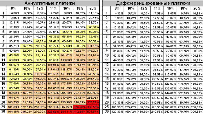 • оранжевым - сумма выплат процентов банку при аннуитетных платежах больше более чем на 20%, чем при дифференцированных;